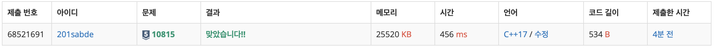 저번 글이었던 7785번과 상당히 유사한 문제다. set을 이용하는 문제이며, set 컨테이너를 이용해야겠다고 마음먹고는 거진 10분만에 풀어버렸다. 문제 난이도 또한 상당히 쉽다. 하지만, 최댓값이 500,000이기에 O(N^2)인 경우 시간초과가 나지않을까 잠깐 걱정했으나, set컨테이너에서 특정 값을 찾는 find 메소드의 시간복잡도는 O(logN)에 불과하기 때문에, 반복문 안에 넣어도 O(NlogN)정도밖에 안나온다. 이 문제의 시간제한이 2초나 되기때문에, 그럴 염려는 없다고 판단한 후 바로 풀어냈다.
