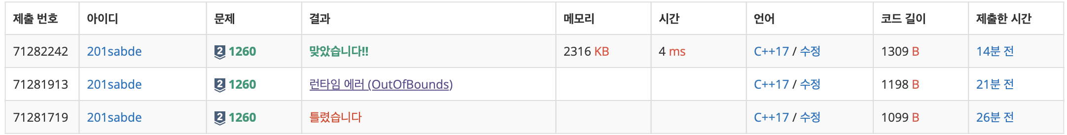 다만 첫번째 시도에서 틀렸습니다가 떴고 두번째에서는 OutofBound 런타임에러가 떴는데, 처음엔 문제를 잘 안읽어서... [단, 방문할 수 있는 정점이 여러 개인 경우에는 정점 번호가 작은 것을 먼저 방문하고,] 이 항목을 제대로 안읽고 그냥 풀었다. 그리고 두번째에는 입력받은 인접리스트 벡터를 정렬하는 과정에서 할당되지 않은 인덱스까지 접근하여 정렬하려 했기때문에 런타임에러가 난 듯 하다.